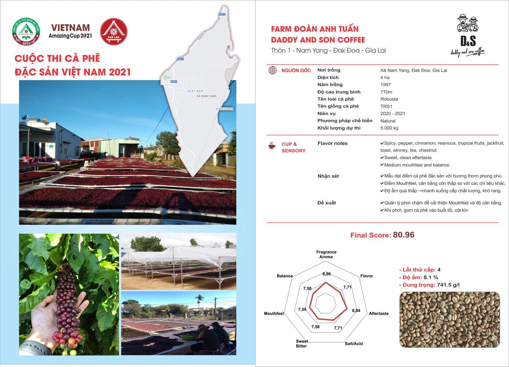 100% hạt Robusta Nam Yang – Gia Lai, được sơ chế tự nhiên mang lại nhiều hương vị trái cây nhiệt đới (Tropical Fruits), gia vi (Spicy) và sô-cô-la đen (Dark Chocolate); đậm đà, ngọt hậu dài lâu.
